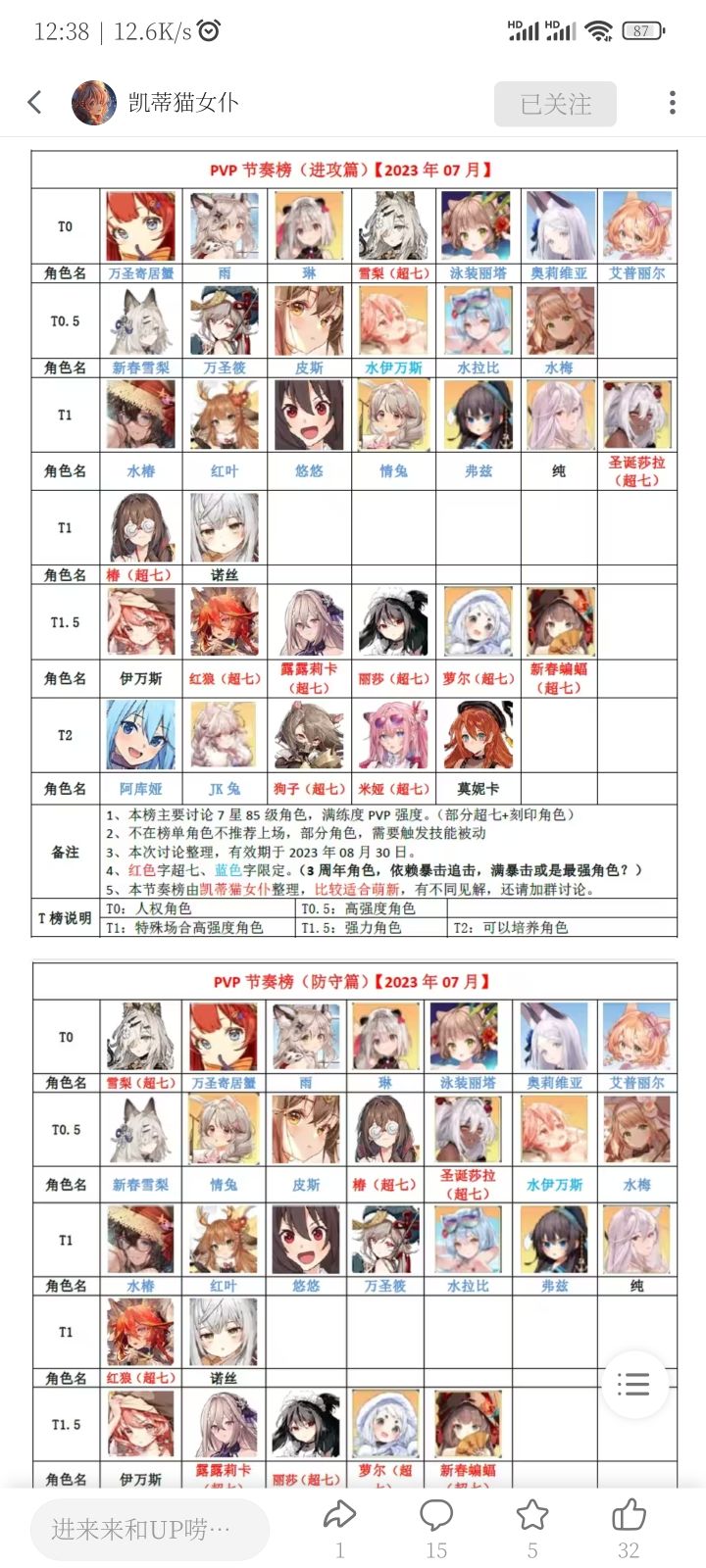 本节奏榜不考虑bug对角色强度的影响。这次由于jjc整体强度拔高删除了不少角色。然后分析一下新卡。德莉可和梅莉娅都具备开局+100sp的特性,意味着腐竹第一回合有可能点到她们。德莉可本身就是可以用于骗雪莉充电腐竹流派中腐竹的第一回合UB(即使死了还能出发被动放多次UB),因此有无脑堆攻击力吸引火力玉石俱焚的打法。梅莉娅看上去一堆技能贼强,实际上还存在几个问题:锁定防御力最低的敌人攻击(不