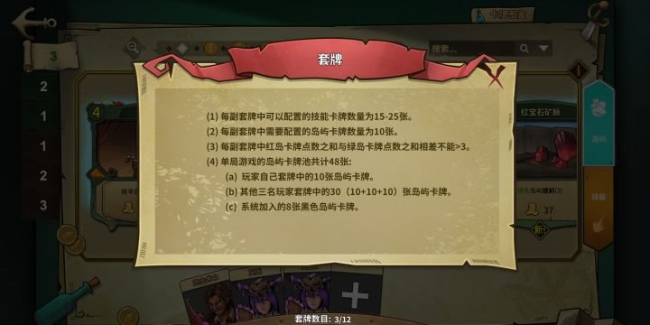 卡牌分为技能卡和岛屿卡,没错,岛屿也是由玩家们建起来的。先是技能卡,之前提到每个角色都有自己的卡牌库,这些是技能卡,也就是出牌阶段选择打出的手牌,除此之外,还有一个所有角色通用的卡牌库,用它们搭配上专属卡牌也可以打出很好的效果,卡牌需要金币或者生命值打出,在卡面左上角标有。每个玩家可以构造一个15~25张牌的卡组加入战斗,卡牌的多少各有利弊,也适合不同的打法。然后是岛屿卡,一套正确的卡组除了要有技能卡,还要搭配10张岛屿卡,岛屿卡有三种,绿色岛屿、红色岛屿、黑色岛屿,各种岛屿都用不同的作用:绿岛代表财富,玩家可平分上面的金币,剩下的留在原地;红岛代表危机,伤害可被防御印记影响;黑岛代表灾难,直接影响玩家生命值,谨慎踏入。绿、红岛屿由玩家的岛屿卡组提供,黑色岛屿为系统自动提供(每局8个)。每局游戏以四个玩家提供的共40张红、绿岛屿卡和系统提供的8张黑色岛屿卡(共48张)组成岛屿卡池,从中抽出24张构成地图。红绿岛屿卡的卡面有三个信息,除了岛屿说明,还有左上角代表红绿岛屿的富有/凶险程度的数值,和右侧现实岛屿可出现的阶段,越富有/凶险的岛屿可出现阶段越后,玩家需要控制左上角的数值之和中和到“红3”~“绿3”之间才可使用(一个tip:如果投入卡池的某一阶段卡牌数量较少,更容易让这些卡牌全部入选该阶段,掌握信息权)。这些卡牌除了黑色岛屿卡,玩家都可以获得,主要获得途径除了赠送就是开桶,到后期一般都可以收集到全部卡牌。关于卡组搭配的更详细规则在游戏内有说明,论坛也应该有卡组推荐,可以去了解一下。还要提的是,绿/红/黑岛分别可以触发技能卡面上的好运/厄运/险境词条,玩好这些词条会让它们打出更好的效果。