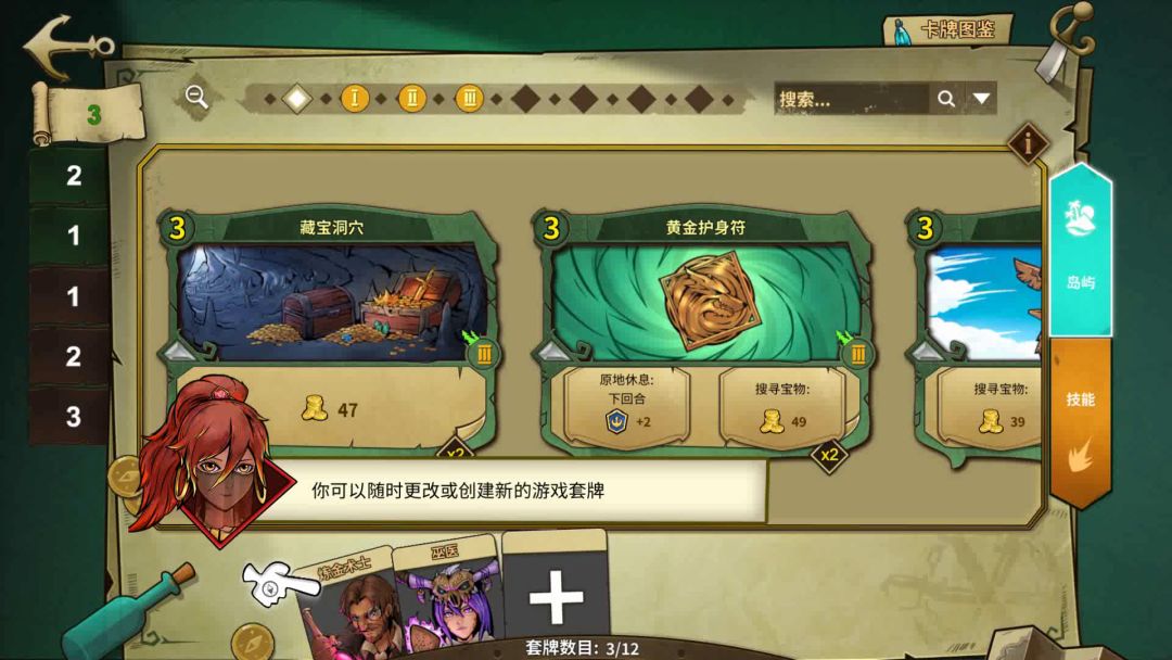 本篇为卡牌组建基础操作指南: 冒险公社发售之际,许多冒险家跃跃欲试想打造一副属于自己的卡组,在探宝过程中所向披靡。可是进入套牌界面便被数量繁多的按钮迷惑的不知所措。别担心,这就带你认识套牌界面,从而认识如何组卡。 首先点开是这样一个界面, 可以看到有非常多的选项,这些选项都有什么用呢? 屏幕右侧的两个按钮为岛屿和技能,我们的卡组是由15-25张技能牌和10张岛屿牌组成的,在这里可以点击查看不同的卡