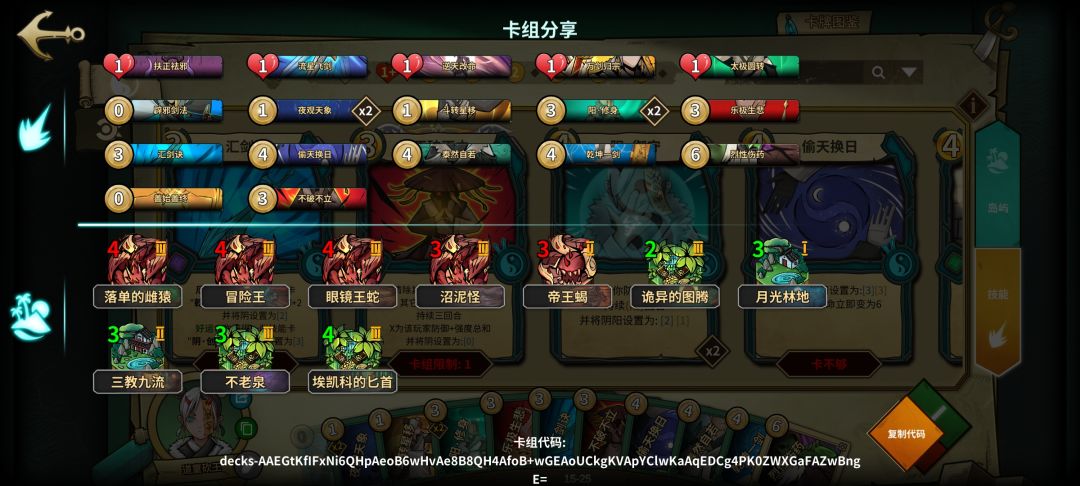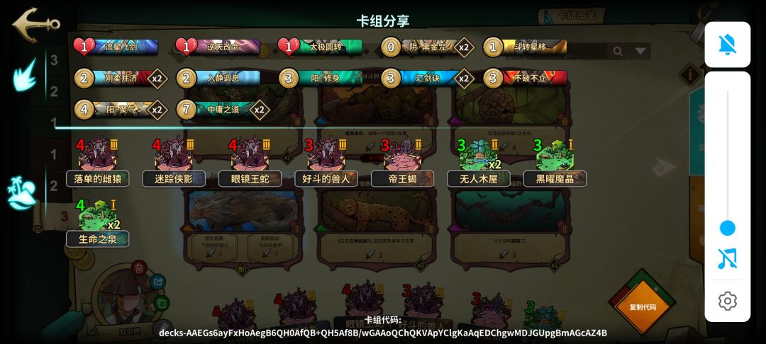 五万分道童卡组,需要的拿 卡组代码 decks-AAEGxJmfFxAM6QHpAeoB6gHrAewB9wH/Af8BhAKFApkCmQKaAqEDChsbHBwvQUFrhQGYAQ== 思路:流星飞剑+风雨飘摇+泰极生否 偷天换日+逆天改命+太极圆转 泰极生否是防一手舞姬,可替换成阴黑金咒或者阴霜降 不要想着时时刻刻打输出,生存能保证的前提下打一套爆发,一波秒人,然后要注意控制自己经济,注意出牌时机 义愤填膺可换成绝处逢生增加生存能力 不破不立我目前也没带了,不是特别契合这套卡组,阴霜降实用性更强