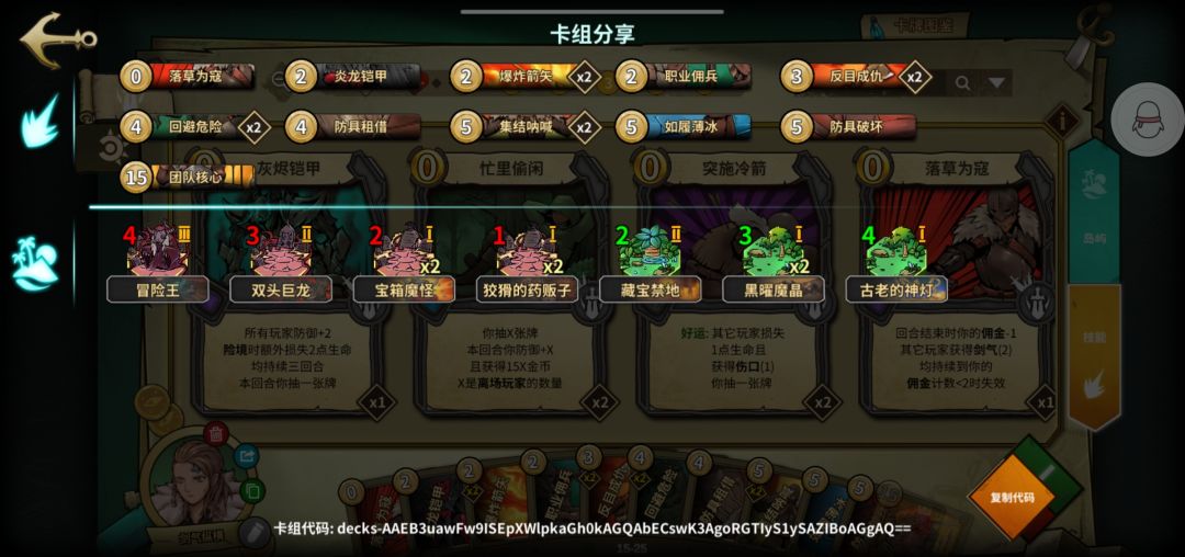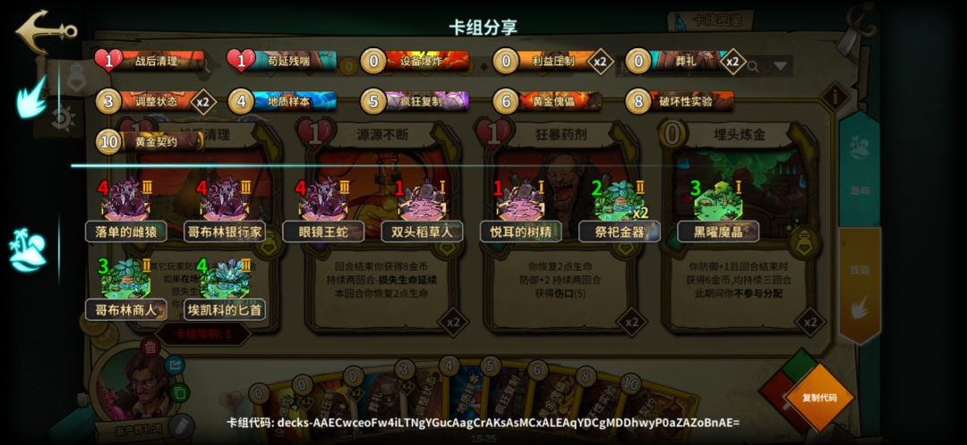 decks-AAEC89BMDwkJHiUlJiYqLTc3rQG4AbgBrAIKBwccHCxpaXaYAZgB 废话不多说,卡组截图跟代码先摆上来。 这是一套超级便宜超高性价比的炼金卡组,没有紫卡,也没有金卡,萌新拿到开服福利随便开几个桶后,将多余的卡牌分解,就可以直接合成,快速成型。 而这套卡组的强度并不弱,不管是面对金卡为核心的产钱卡组或杀人卡组,都有一战之力,只要猥琐稳健一点,起码是基