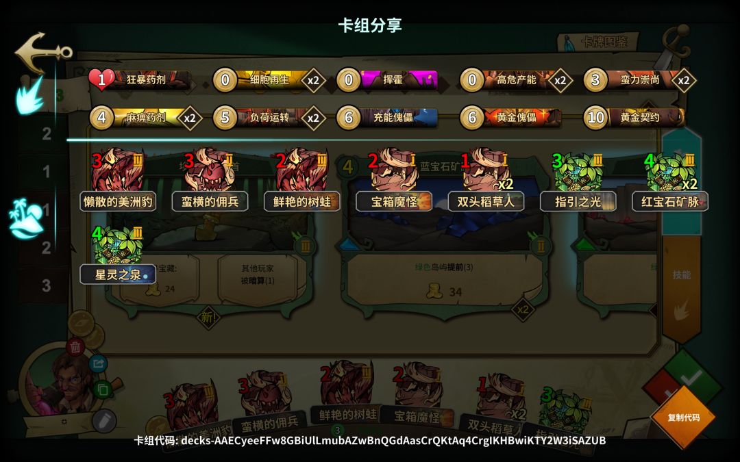 11张保命牌保证了你的生存能力,四张收益牌决定了你的金币效率, 因为牌组使用金币最高的只有负荷运转, 所以利益压制可以准确地复制到负荷运转, 这套卡的核心就是叠负荷运转。 另外轻装上阵几乎是必出的, 因为只有负荷运转和麻痹药剂达到4金币以上。 牌组代码如下: deckc-AAEC+vKZFw8EFB4gJSUoKJ0BnQGrAqwCrAKtAq0CCjMzNDY5UlVVdpIB