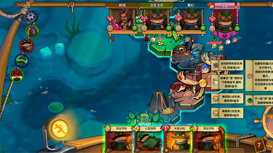 1、新手岛屿明盘,猜岛机制根据在场人数减少而变复杂。 2、绿岛=好运、红岛=厄运、黑岛=险境,绿岛产钱,红岛扣血打防御牌抵消,黑岛真伤不可避,建议默写。 3、金币多者头像居右侧,角色返程可避险,角色昏迷在场分金,金币大于均值获胜。