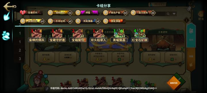卡组合集,仅供参考伤口炼金 t2-2.5之间,个人评估仅供参考decks–AAE***xMDwYGJSUuLmubAZ0BnQGrAq0CrQKuAq4CChwcMjI2NltskgGSAQ==上限高,有贪的构筑,利益压制负荷,但是吃环境,1阶段出门红罗盘极端难打,起手刷负荷,红岛刷甲,3阶段收益极高。起手刷负荷红罗盘刷甲。分配炼金 t1.5-2之间decks-AAECpMxMEAYjJ