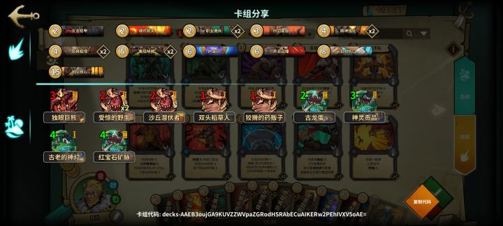 deckc-AAEB3oujGA9KUVZZWVpaZGRodHSRAbECuAIKERw2PEhIVXV5oAE=这套佣兵流卡是根据网上加自己理解搭配出,能够稳定上分一岛保血不要贪钱除非没钱出卡,通过“炎龙铠甲”或“集结呐喊”的二次护盾在红岛时出“职业佣兵卡牌”攒佣兵币,绿岛用“防具租借”攒佣兵币,为以后的爆发式收益奠定基础“切记切记不要贪💰”。面对敌方输出输出或减甲在红岛“爆炸箭矢”的