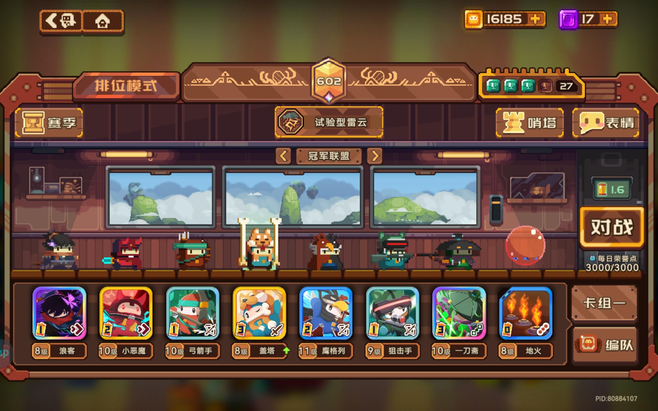图1是最开始刚上来一发抽到了炎拳,就以他为核心组了一个卡组。核心思路是弓箭手和冲塔前期想办法偷血,后期全力防守的思路。防守赚费,拿赚到的费用去无成本上偷血的角色。 开局思路: 1。有冲塔或弓箭手直接下,试探对方卡组。然后剩下卡去防守赚费直到四费的回合 2。没有偷塔就下一个二费一个一费,或者下一个一费看看下一张可不可以磨血(此时手头一定有火拳,剑圣等解场性质的卡牌) 玩到7-1的时候 发现5费的回合