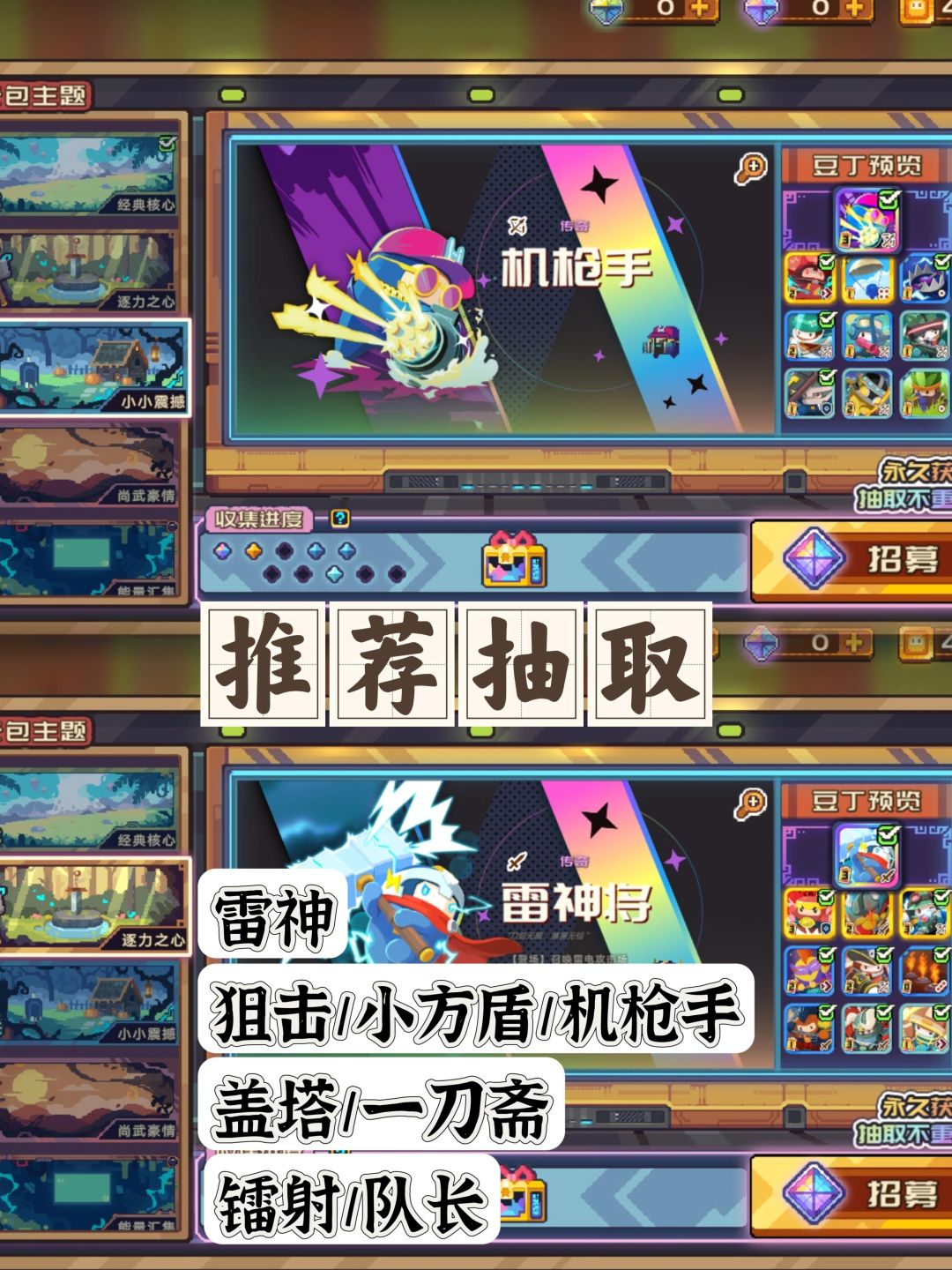 年关将近,砰砰军团也是顺利公测。那么话不多说,我们这就开始今天的攻略内容。 1,卡池优先or豆丁优先度: 首先我们可以看到,游戏内部是一共有四个常驻池➕一个经典池,经典池无需我们投入资源,正常游玩即可全部解锁。 但是四个常驻池,优先抽哪个,可就是一个问题了,毕竟这直接决定了这两个星期你的游戏体验。 首先我建议先抽【尚武豪情】这个池子。 这个池子里有着目前版本第一前排的神卡,【盖塔】。 强大的复活机