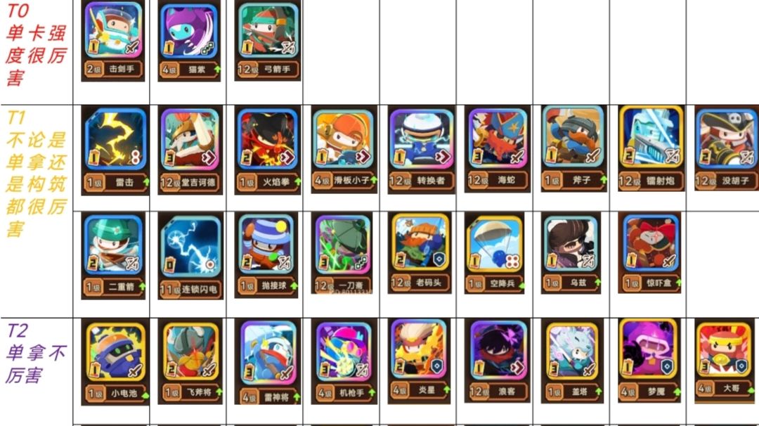 有争议的我说一下 ♦英格列t1.5,数值超模,但毕竟是排队游戏。这游戏射手要担重任的,不能劈塔就天生短板。 ★二重箭t1.5,强度远不如鹰,但威胁度与推进游戏进程能力不比英格列差。 ♦面具狂t2,高分段根本上不了场。偏娱乐。 ★滑板t4,撞不动僵尸,压不过大锤。s10赛季被完爆。 ♦镭射t1, 质疑的人玩双穿被我单核镭射爆了三把。英格列根本打不过雷射。会被英格列推只能证明不会玩。 ★僵尸t0, 削