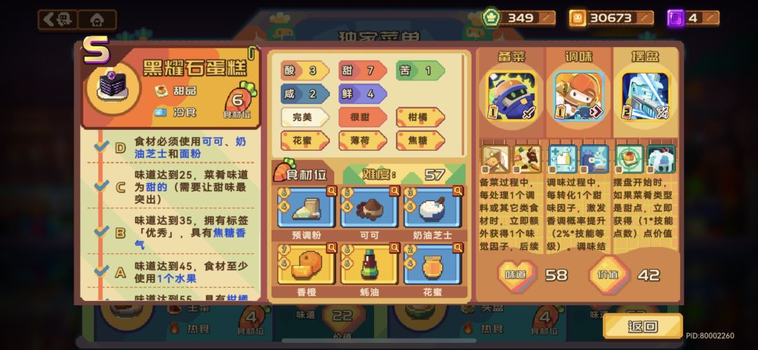 本图鉴包含 经营向、满足多重需求的经营/极限食谱 通用升级餐厅星级的好感度食谱 易复刻低成本的基础食谱 ================================ 娱乐向食谱 - s级1价&f级136价 ================================ 【经营/极限食谱】 经营收益=完成奖励+小费 单食谱小费=食客基础小费+0.1*食谱价值 单食谱小费上限=食客基础小费+评价