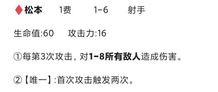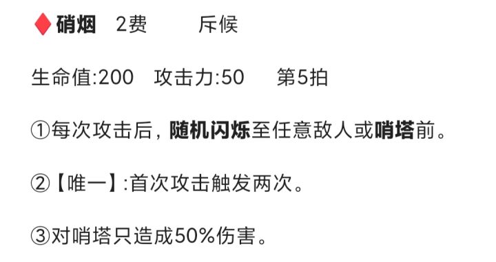 她定位是斥候般的担克,尖端材料学的抗性与RT立场微弱的范围效应,使她十分灵活(虽然伤害一般,但是一个很强的压线能力的豆丁)想法是格挡远程攻击【立场会吸收一定量上限的伤害】阻断范围伤害【特殊材料】,她会越过除敌方射手外的所以目标豆丁,直到前方出现敌方射手【诺该射手在其他目标身后,将不会越过该目标,多个目标相同】, 攻击范围0-2,攻击的同时会为后方一格内的单位少量治疗和伤害减免