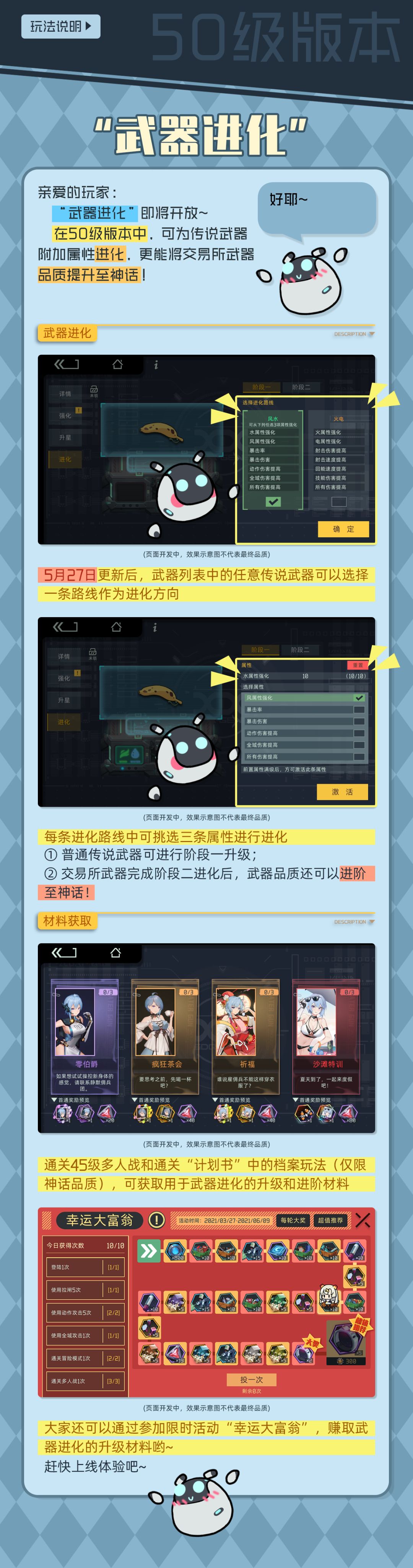 亲爱的玩家: 【武器进化】即将开放! 5月27号版本更新后,玩家可为武器附加进化属性,并且将品质提升至神话~ 了解详情 ↓↓ --------------------------- 写一张夸夸卡: 关注我们了解更多信息,有各种福利哦~~ 官方QQ群:映月城与电子姬官方7群(群号:466261570) 微博: 公众号:映月城与电子姬(微信号:FB-PTM) 官方抖音号:映月城与电子姬(抖音号:Pha