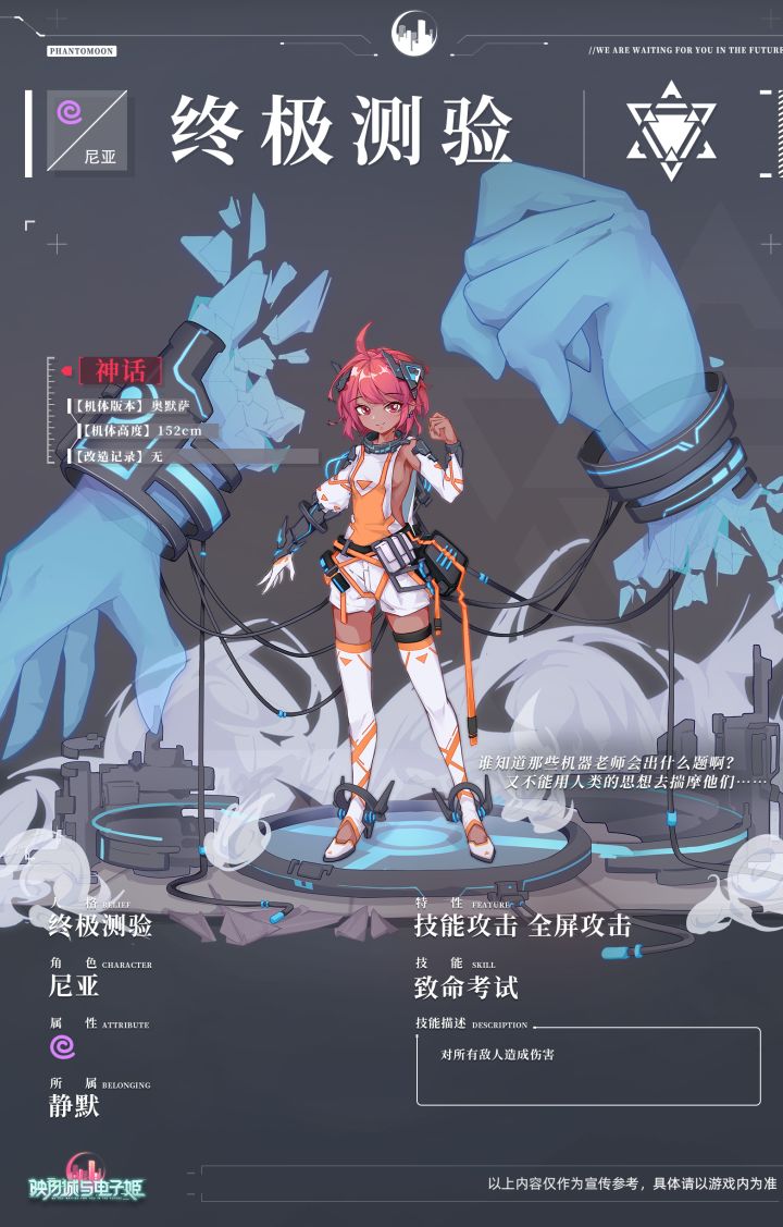 即使是在映月城的学校,学生们也要面对考试,这也是尼亚心目中自己遇到的最大的人生挫折。【人格属性】混乱【主動技能】致命考试 ✦4对所有敌人造成伤害【特性】技能攻击 全屏攻击--------------写一张夸夸卡:关注我们了解更多信息,有各种福利哦~~官方QQ群:映月城与电子姬官方1群(群号:821426476)微博:公众号:映月城与电子姬(微信号:FB-PTM)官方抖音号:映