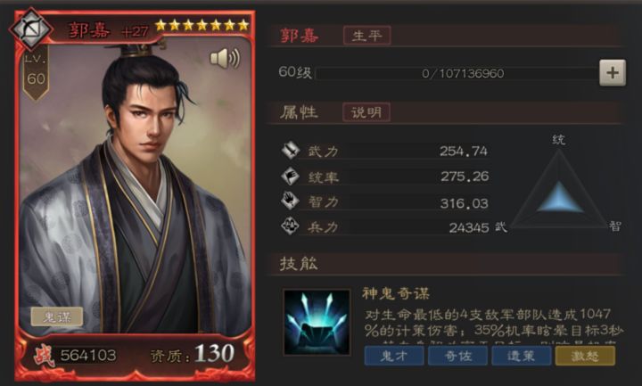 服务器: 1服-群雄逐鹿军团:大唐天子游戏ID:小小水蜜桃大家好,我是1区【大唐天子】军团的【小小水蜜桃】,又和大家见面了。今天更新了130红将郭嘉,是第一个能满7星的红将。托军团里土豪的福,拿到了第一手资料,现在给大家分享一下红将的数据以及搭配阵容的个人看法,希望能帮助到大家哈。 从上图可以看出,郭嘉作为智弓,智力非常的高呀,战斗力也达到了惊人的56万,同时技能组也是非常的厉害。主技能