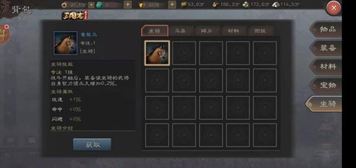 服务器:群雄逐鹿军团:大唐天子游戏ID:大唐乌洋各位好,我是一区群雄逐鹿的大唐乌洋,作为一个小氪玩家,浅析下蓝色马儿对战力的提升。为了写本次稿子,用了两天时间大量的击杀马贼,爆率真是感人。马儿是通过击杀大世界的马贼掉落碎片合成的。蓝色马儿有三种,分别为黄鬃马、白鬃马和黑鬃马。3种马的属性都是一样的,在0级的时候都是攻速加1%,命中加0%,闪避加0%。其中黄鬃马在战斗时加0.2%的智力,白鬃