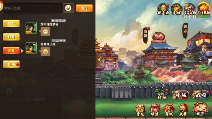 社交系统①聊天功能:玩家可在游戏中分联盟和世界两个频道聊天。②好友功能:玩家可以在交互系统中互加好友③邮件功能:玩家可以通过邮件系统来接受系统奖励及消息