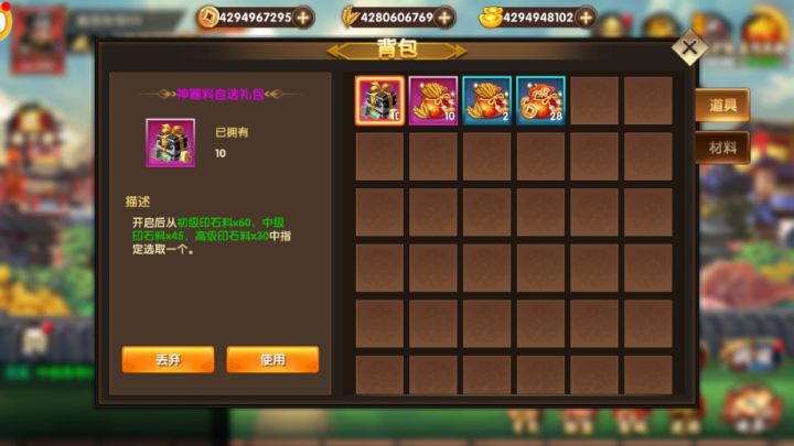 背包系统:分为道具和材料2个页签,每个页签栏位无限制。道具栏可使用和丢弃道具,材料栏中存放游戏内各系统消耗道具、训练材料可出售成铜钱。