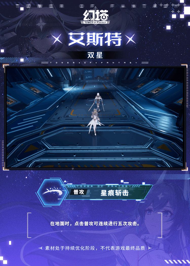 ——双星,迅捷、精确、完美,能够在隐蔽、无声作战中起到重要作用。 +++艾斯特普攻+++ 在地面时,点击普攻可连续进行五次攻击。 滞空时,点击普攻可在空中连续进行五次攻击,并消耗耐力。 在地面处于光刃超频状态下时,点击普攻可连续进行五次攻击。 滞空处于光刃超频状态下时,点击普攻可在空中连续进行五次攻击,并消耗耐力。 +++艾斯特闪避+++ 方向键加闪避键触发的前闪避短暂时间内,点击普攻,可触发前闪