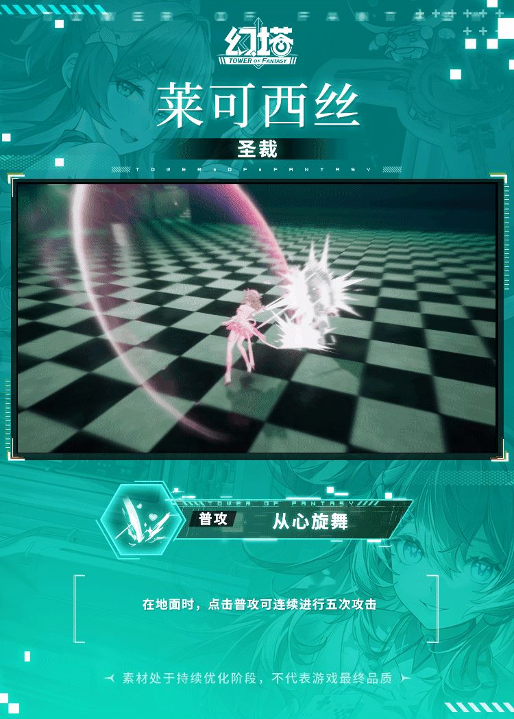 ——圣裁,闪烁着柔和光芒的巨大镰刀。比起斩断生的希望,它更希望斩断和死亡之间的链接。 +++莱可西丝普攻+++ 在地面时,点击普攻可连续进行五次攻击 滞空时,点击普攻可在空中连续进行五次攻击,并消耗耐力 在地面普攻时,使用第一次至第二次普攻中,长按普攻可触发掠影突袭 在地面普攻时,使用第三次至第四次普攻中,长按普攻可触发跃光奔袭 滞空时长按普攻或存在敌方目标时点按,攀爬,反向跳攻击或使用喷气背包普