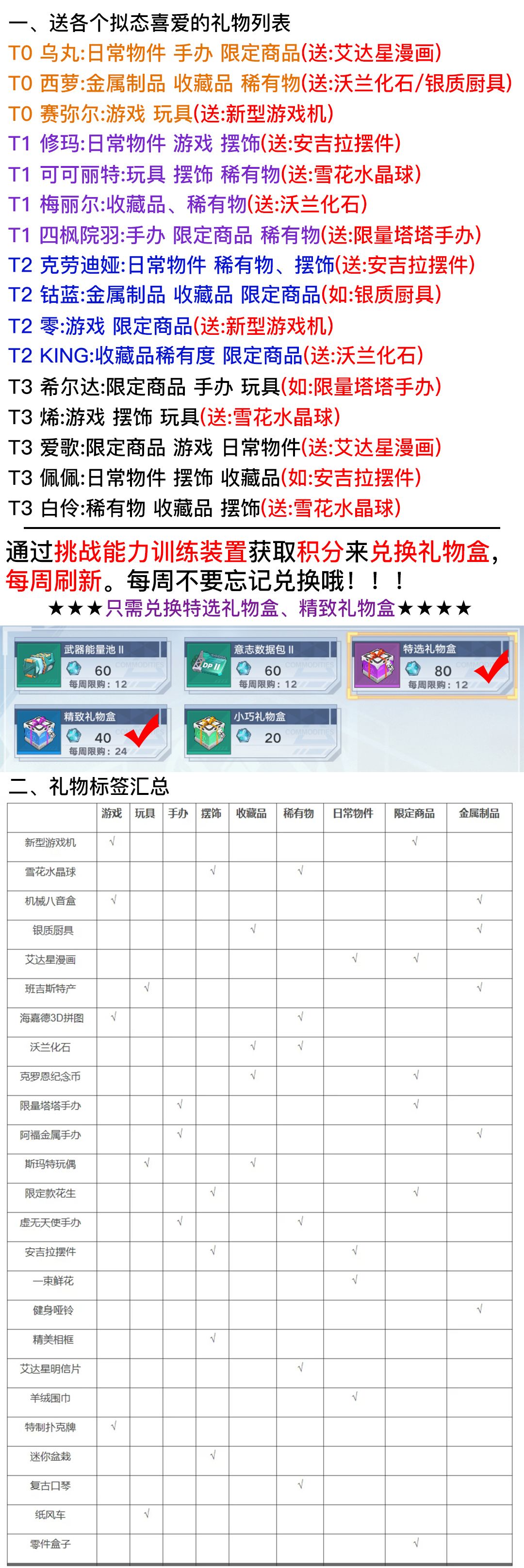 每天能力训练积分能拿到600-800左右 好感度礼盒需要: 特选12*80+精致24*40=1960积分 《有多的积分可以换小巧礼》 小巧礼盒建议第二个星期再换 特选好感度礼包12个+精致礼盒24个 对应好感度礼品: 紫色一个+80 精致一个+30 小巧一个+15 好感度为:12*80+24*30=1680点 差不多2个礼拜左右就能拉满一个4000好友度 【礼物盒】可以通过每天挑战能力训练装置 获