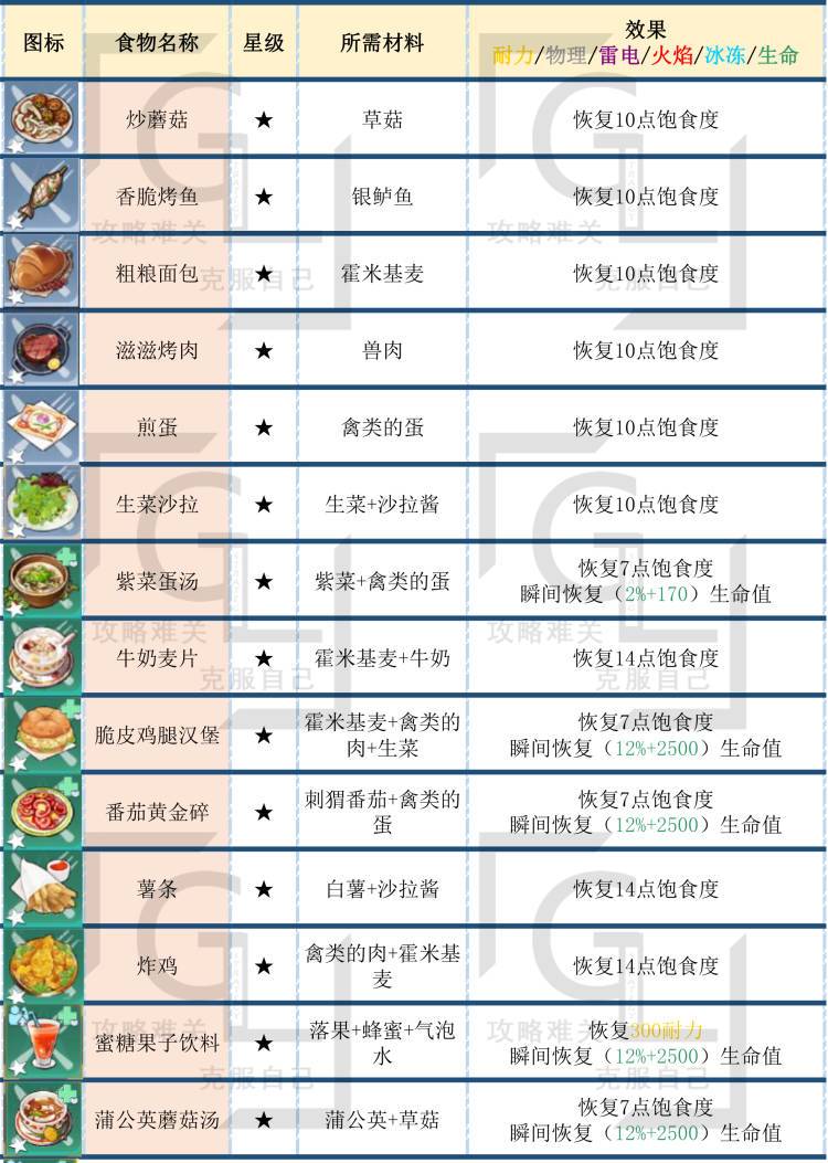 纯饱食度类 1.香脆烤鱼:15饱食度 1银鲈鱼:河流 2.粗粮面包:15饱食度 1霍米基麦:星岛草地,班吉斯草地 1禽类的蛋:高处鸟巢 3.滋滋烤肉:15饱食度 1兽肉:狩猎野生动物 4.炸鸡:15饱食度 1禽类的肉:狩猎禽类 1霍米基麦:星岛草地,班吉斯草地 5.炒蘑菇:20饱食度 1草菇:星岛巨型蘑菇,克罗恩地区 1幽灵菇:星岛龙骨和墓地 6.脆皮鸡腿汉堡:20饱食度 1霍米基麦:星岛,班吉斯