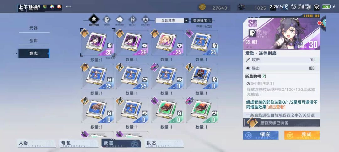 幻塔萌新小常识(意志篇) 各位来自异世界的拓荒者你们好,我是挨打星大魔王,欢迎来到挨打星接受毒打,之前已经让你们对武器有了一个详细的认识,接下来说说提升武器作战能力的关键因素——意志。 在我们武器界面的右上角有一个小方块,这里就是意志的入口,它的四个角就是意志的镶嵌位置和外在表现,颜色代表品质,绿色是N,蓝色是R,紫色是SR,金色是SSR. 进去之后的界面是武器环绕着四个芯片一样的部件,左侧是你所
