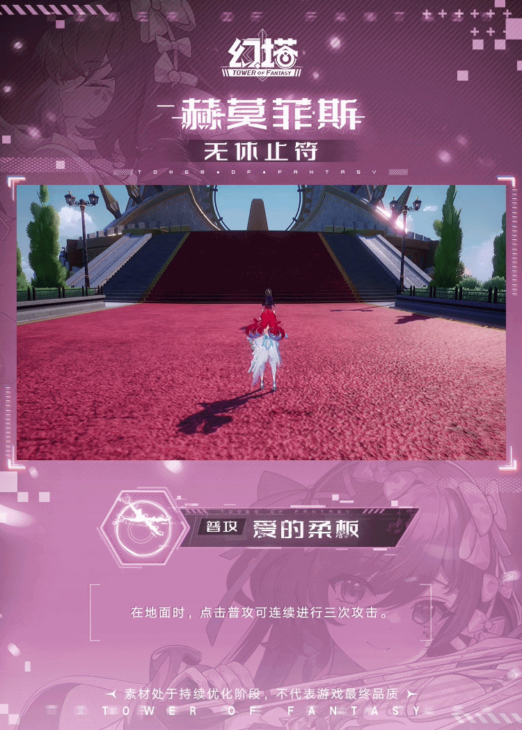 ——让我为你谱写最后的音符!+++赫莫菲斯普攻+++在地面时,点击普攻可连续进行三次攻击。在空中时,点击普攻可连续进行三次攻击。在地面时,长按普攻可持续发射音符攻击。每个音符对目标造成伤害并获得协奏能量。滞空时长按普攻(存在敌方目标时点按),攀爬,反向跳攻击或使用喷气背包普攻,可触发沉思咏叹调。从空中下落,落地过程中对命中的敌人每次造成伤害,落地后对附近目标造成伤害。+++赫莫菲斯闪避