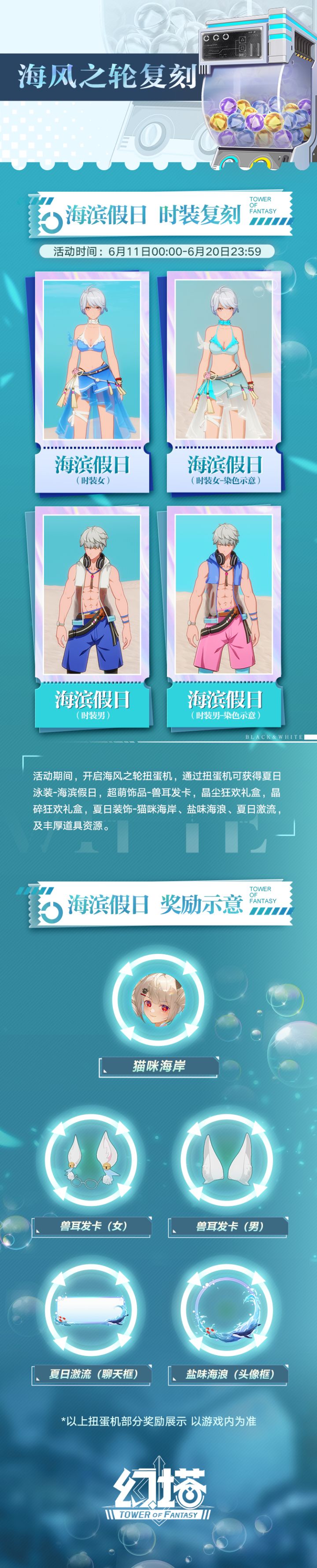 海风经过这天,扬起裙摆弧线,跑向薄荷色的夏日心愿~ +++活动时间+++6月11日00:00-6月20日23:59+++活动简介+++活动期间,开启海风之轮扭蛋机,通过扭蛋机可获得夏日泳装-海滨假日,超萌饰品-兽耳发卡,晶尘狂欢礼盒,晶碎狂欢礼盒,夏日装饰-猫咪海岸、盐味海浪、夏日激流,及丰厚道具资源。塔塔小贴士:1、6月11日0:00,塔塔将给18级及以上的授权者送出5个扭蛋币,记