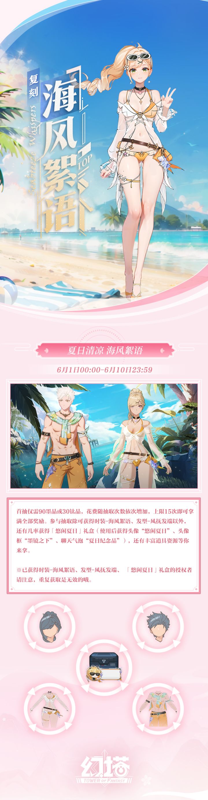 乘着阳光与海风,继续你的夏日冒险~+++活动时间+++6月1日00:00-6月10日23:59+++活动简介+++首抽仅需90墨晶或30钛晶,花费随抽取次数依次增加,上限15次即可拿满全部奖励。参与抽取除可获得时装-海风絮语、发型-风抚发端以外,还有几率获得「悠闲夏日」礼盒(使用后获得头像“悠闲夏日”、头像框“墨镜之下”、聊天气泡“夏日纪念品”),以及丰富道具资源等你来拿。塔塔小贴士:1