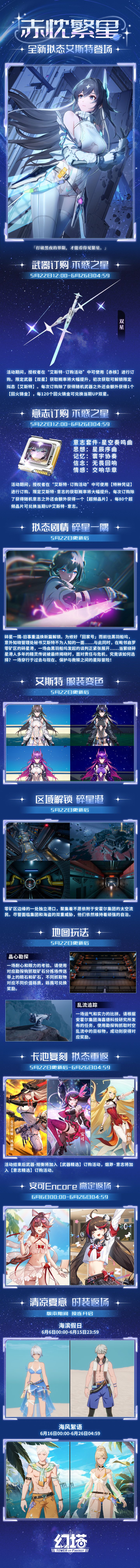 「打破黑夜的界限,才能看得见繁星。」★艾斯特限定订购★即将开启++活动时间++2025年5月22日12:00-2025年6月26日04:59++活动说明++✦ 活动期间,授权者在“艾斯特订购活动”中可使用【赤核】进行订购。限定武器【双星】获取概率将大幅提升,初次获取可解锁限定拟态【艾斯特】。每次订购除了获得随机武器之外还会额外获得1个【回火铸金】(回溯服为回火铸金·超新星),每120个回