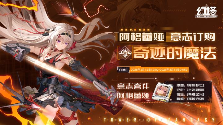 「跨越星空的魔法奇迹」★阿格蕾娅限定订购★即将开启++活动时间++2026年2月12日12:00-2026年3月19日04:59++活动说明++✦ 活动期间,授权者在“阿格蕾娅订购活动”中可使用【赤核】进行订购。限定武器【时之心】获取概率将大幅提升,初次获取可解锁限定拟态【阿格蕾娅】。每次订购除了获得随机武器之外还会额外获得1个【回火铸金】,每120个回火铸金可兑换当期UP 时之心。✦