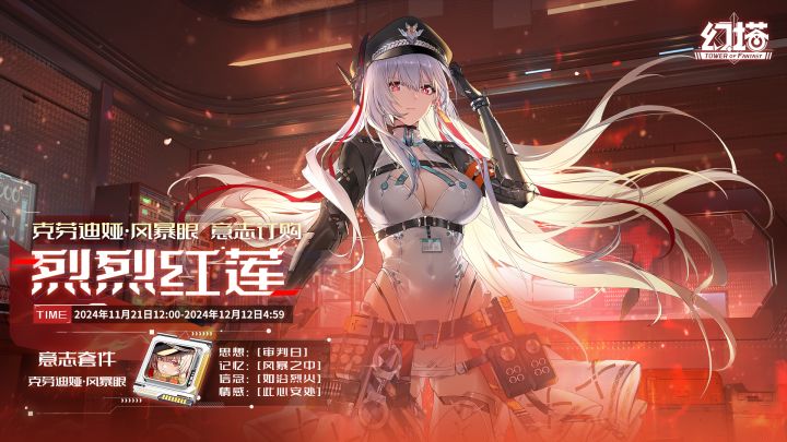 「这把利刃,随时乐意为你劈开眼前的暗夜。」★克劳迪娅·风暴眼限定订购★即将开启++活动时间++2024年11月21日12:00-2024年12月12日04:59++活动说明++✦ 活动期间,授权者在“克劳迪娅·风暴眼订购活动”中可使用【赤核】进行订购。限定武器【赤风】获取概率将大幅提升,初次获取可解锁限定拟态【克劳迪娅·风暴眼】。每次订购除了获得随机武器之外还会额外获得1个【回火铸金】(