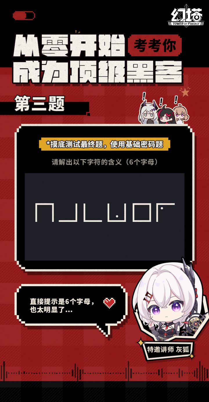 我要让灰狐知道,我能接下挑战,成为下一名黑客!第二关:本题将测试你的逻辑思维与观察力,看你是否有潜力成为黑客,请仔细阅读考题,321请回答~塔塔小贴士:摸底测试考核共设有三关,一人通关全员享福,三关全过解锁灰狐专属赤核*1,快来评论区留下答案,造福全授权者吧!
