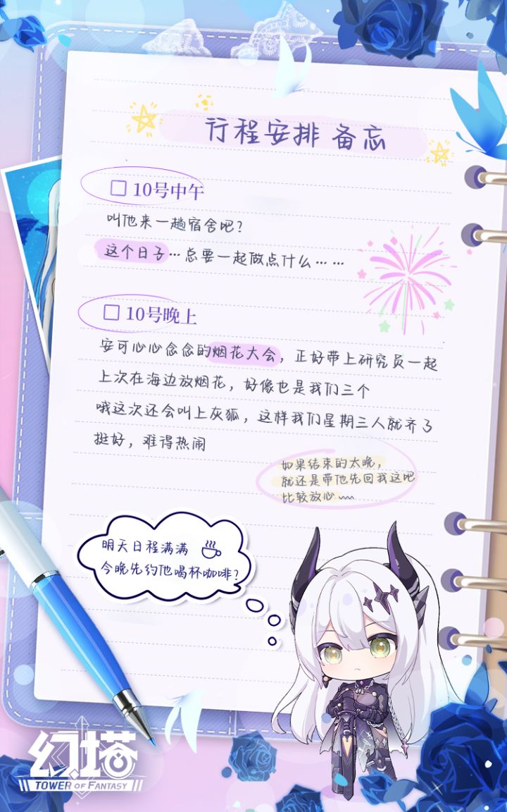 星期三的大家来得好早,希望没有让她们久等。诶诶诶,为什么洛斯琳也在?!可千万别突然上演你追我逃的警匪大戏…咻—— 砰!哇,怦然绽放的花火,宣告一场Lv.9999的七夕约会正式开启!暂且一起逃离复杂的现实吧~又一年炽热且绚烂的夏夜,这一刻,只留下心动的痕迹…祝大家七夕快乐嗒ლ(°◕‵ƹ′◕ლ)塔塔小贴士:浪漫七夕,请接收塔塔满满的爱,全新动作-喝咖啡已于8月10日00:00通过邮件直接