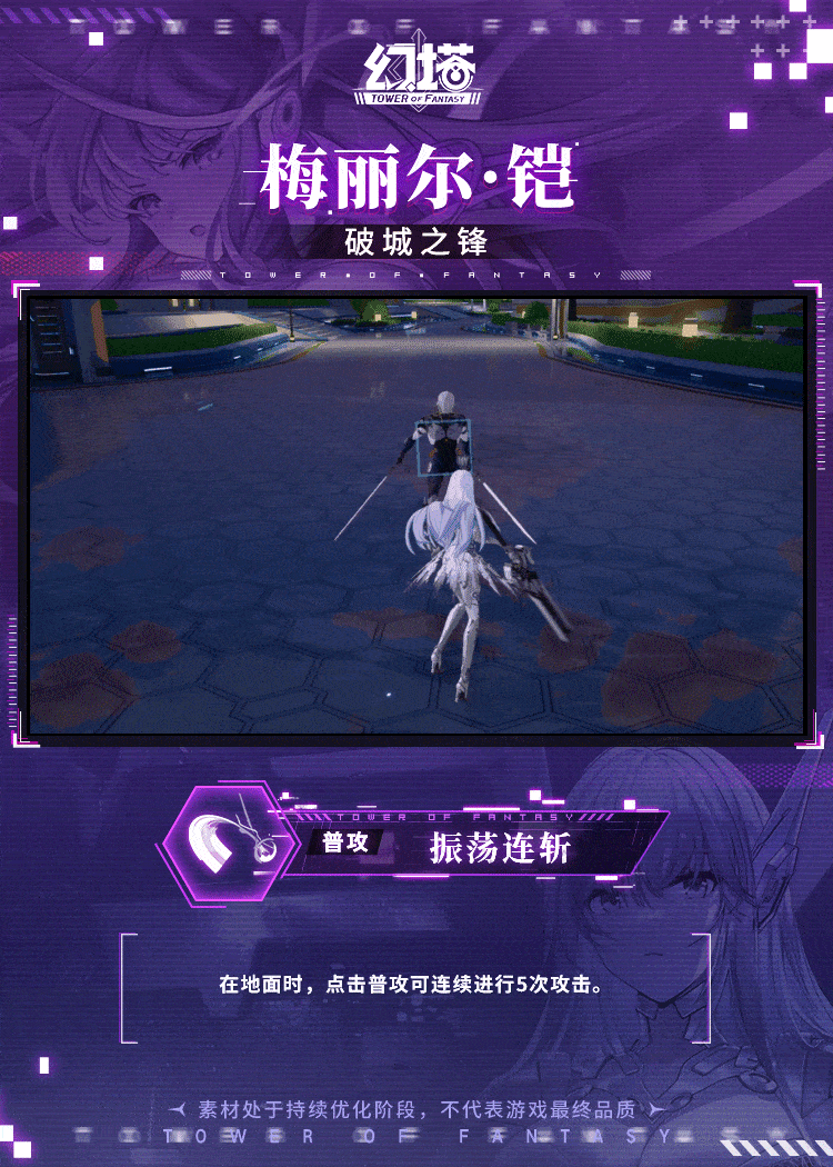 「过去的恩怨,就此了结吧!」+++梅丽尔·铠 普攻+++在地面时,点击普攻可连续进行5次攻击。滞空时,点击普攻可在空中连续进行5次攻击,并消耗耐力。在地面普攻时,使用第1次至第2次普攻中,长按普攻可触发崩雷裁断;使用第3次至第4次普攻中,长按普攻可触发电掣一挑。在地面时,长按普攻可触发阳电射击。滞空时长按普攻,可触发荷电瞬身。从空中下落,落地过程中对命中的敌人造成伤害,落地后对附近目标造成