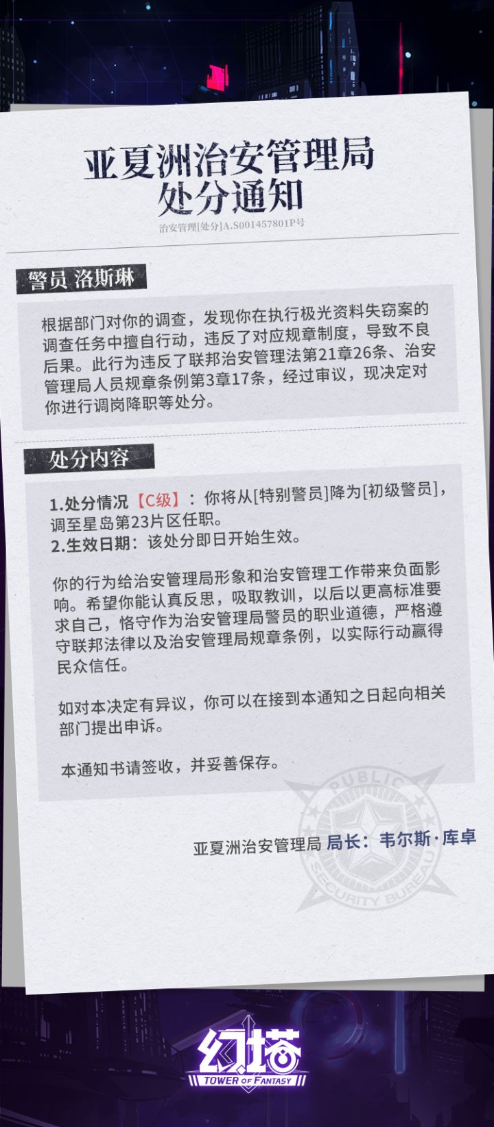 【极光资料失窃案·案发后第20天·治安管理局】▌▌▌权威发布▌▌▌忍不了了,说降就降,我们底层探员也是很辛苦了,这么多年了,有没有给我们换过小摩托,工资有没有涨,警用装备有没有更新,一个人管这么多大块街区也是很辛苦的。哦,原来降职的是洛斯琳警官啊,那没事了
