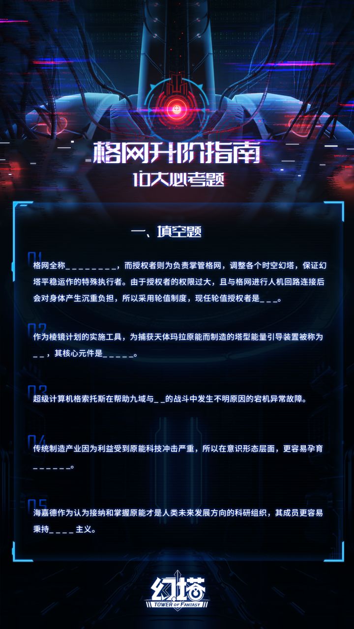 为迎接即将到来的格网世界,第一届(极有可能也是最后一届)的授权者浓度测试现在开始!各位执行者请即刻前往“先遣考场”,认真读题,并进行填空与选择。最后,一位塔姓伟人曾说过:虚拟世界是一场对现实的浪漫逃亡,在格索托斯复原的虚拟世界里,新的冒险即将启程,执行者记得来赴四月之约!