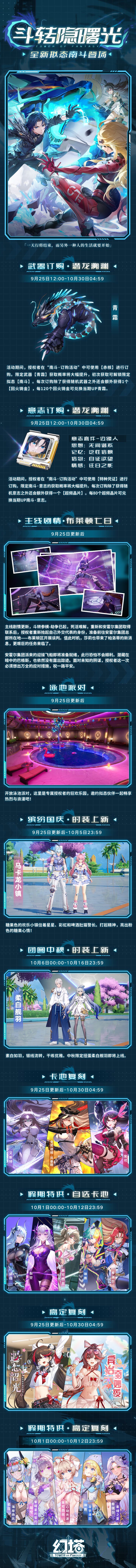 亲爱的授权者:《幻塔》将于9月25日3:00-6:00进行停服维护更新。更新完成后将开启全新版本5.4「斗转隐曙光」。02:30起【冒险选做】、【冒险挑战】的玩法入口与【转服功能】将暂时关闭。开服的具体时间可能会根据维护情况有所提前或延后。请各位授权者相互转告,并合理安排游戏时间。更新结束后塔塔将通过邮件,为9月25日3:00前到达18级的授权者寄出维护补偿:墨晶*300,邮件有效期为30天,