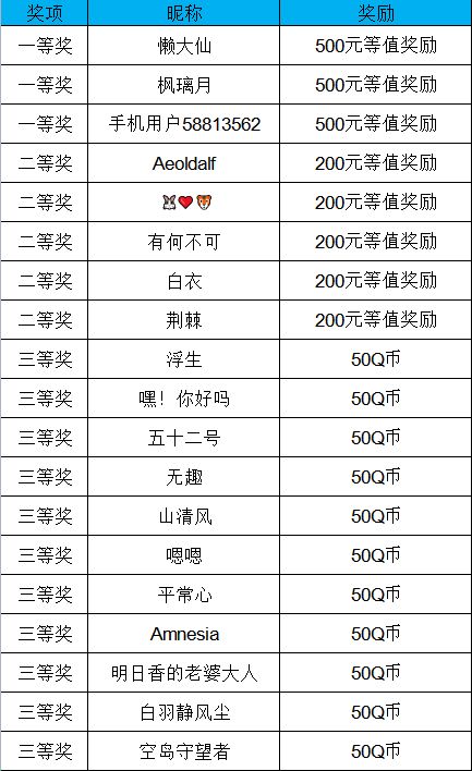 本次活动已经圆满结束,恭喜以下获奖的主公大人!感谢大家的积极参与!没有获奖的主公也不要灰心,后续还会有其他活动,大家可以多多关注一下我们的论坛哦~ 【获奖名单】 请以上获奖的主公,于5月30日前在本帖下留言提供您的手机号以及QQ账号,以便我们联系您进行奖励发放~过期仍未提供视为自动放弃本次活动奖励。———————————————————————————————————— 【活动原贴】 亲爱的各位主
