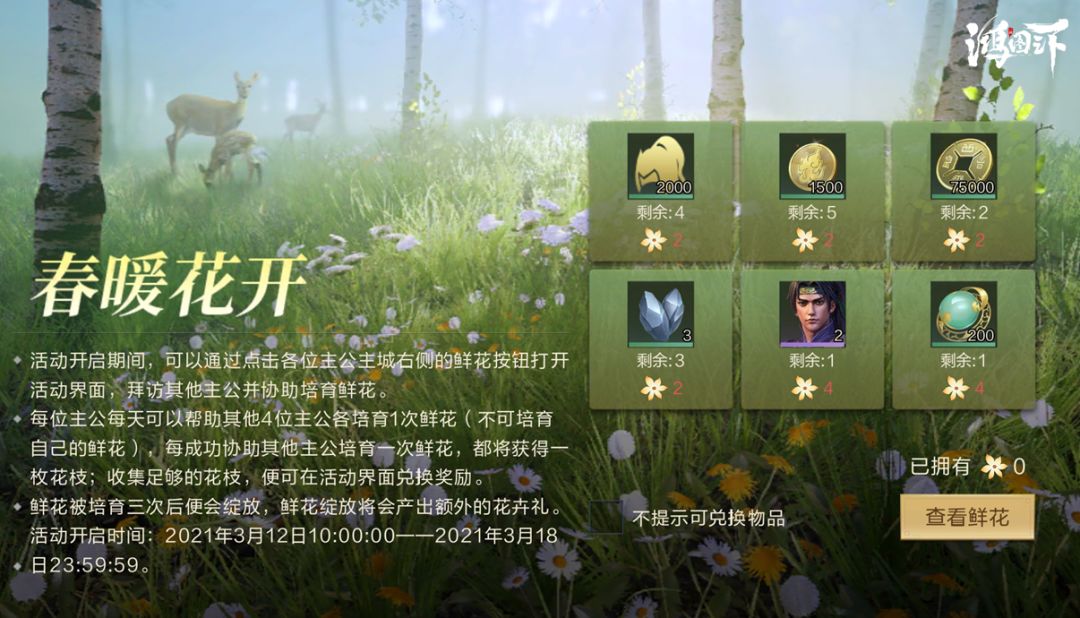 凛冬已逝,万物复苏 一切都像刚睡醒的样子 青草丛生,绿柳抽芽 朵朵桃花点缀着枝头 在暖阳中争相盛放 果然是正值春天 连貂蝉姐姐都为这春景着迷呢~ 鸿图世界也洋溢着春天的气息 明日恰逢植树节 主公城边即将有鲜花出现哦! 勤劳的主公们 准备好来鸿图“云养花”了吗? 听说帮助朋友培育鲜花,收集花枝 还可兑换珠玉、预备役、铜币等奖励! 快来看看活动详情吧~ 春暖花开 “等闲识得东风面, 万紫千红总是春”