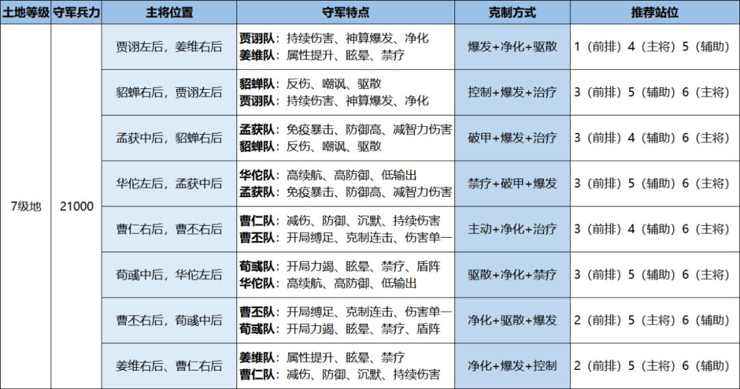 S3赛季资源地守军强难度上升较大,大多数开荒队伍在6级地之前还能依靠武将、技能优势来降低野地难度。但面对7级地时因为发育节奏问题会落后7级守军的强度,此时需要我们寻找合适自己的7级地才能以较低战损完成开荒。 为助力主公们开荒,小图这就来为大家介绍由大神主公带来的7级地站位以及守军阵容讲解,快来看看吧~ 【七级地配置】 【七级地技能图示】 【贾诩队】 贾诩队核心输出全在于主将身上,吕蒙与朱儁输出能力