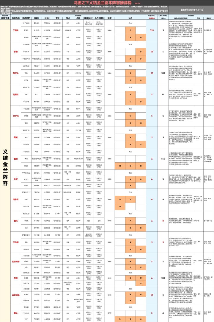 本次给大家带来的是这周六的新剧本义结金兰的阵容推荐表!部分阵容技能会有冲突,大家可以根据战场变化和自身的武将选择出阵容,叠甲:克制的阵容也有运气问题打不过哈,本阵容表仅供兄弟们参考!如有错误,欢迎指正!