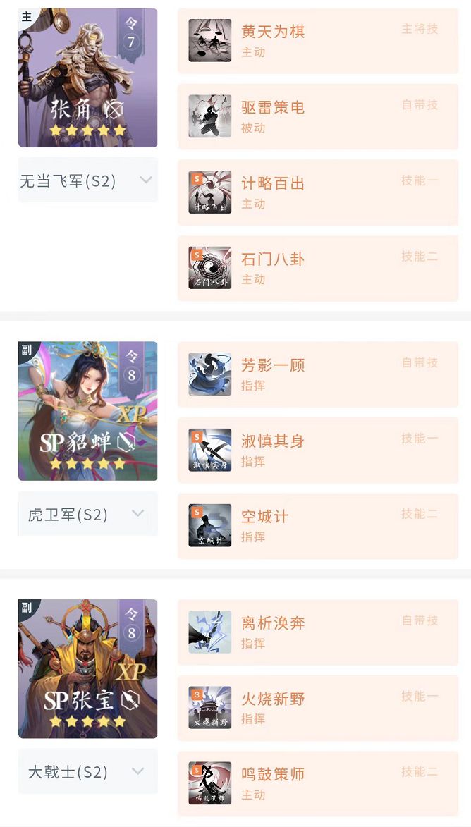 经过这段时间的适应,巅峰赛季的最新的主流阵容模板基本稳定了下来,虽然每个区服所处环境有一定区别,但主流队伍中除了个别变种分支和替换技能,大多都是一样的搭配,主公一起来看看吧~【黄天队】黄天是巅峰赛季目前分支变种最多的体系,以张角为中心衍生出了张宁、张宝两个基础分支。其中张宁系以司马徽、SP周瑜为主,而张宝系演化出了荀彧、张仲景、司马昭、SP貂蝉等多个变种。主公可以移步查看详细配置,配将站中也有
