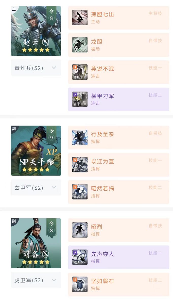 主公们好呀,还记得以双核连击为输出路线的蜀枪吗?这个已经久别战场的队伍,现在通过另一种方式延续下来啦!一起来看看新蜀枪有哪些不同的地方吧~【阵容推荐】站位推荐:1(赵云)4(SP关平)5(刘备)或3(赵云)5(刘备)6(SP关平)【搭配思路】这套蜀枪模板沿用了蜀枪的连击输出思路,但对阵容框架进行了较大改革。首先是将双核转为单核,由原先的一辅二打法变为二保一打法,整体类似于三枪赵云的路线,但