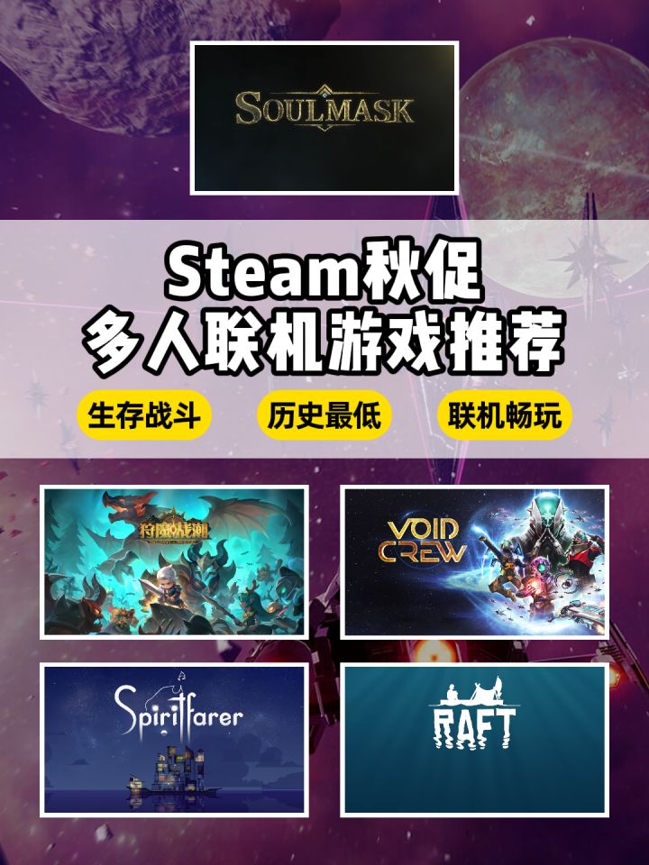 Steam秋促已至🎉,联机游戏也迎来了一波折上折🎁,一起来看看有哪些值得入手的!👀👇1.🎮《灵魂面甲》🛡️:作为部落🏕️最后的希望,你能否重新将部族壮大?💪🔥2.🎮《狩魔战潮》🧛♂️:支持双人对战👥的类吸血鬼🧛幸存者游戏,搭配遗物、技能、天赋抵御怪物!🛡️💥3.🎮《虚空航船》🚀:与伙伴一起在无垠的宇宙中遨游🌌,建设自己的宇宙飞船🛰️,与外星人👽战斗!💪🌠4.🎮《灵魂旅人》🚣♂️:扮演灵