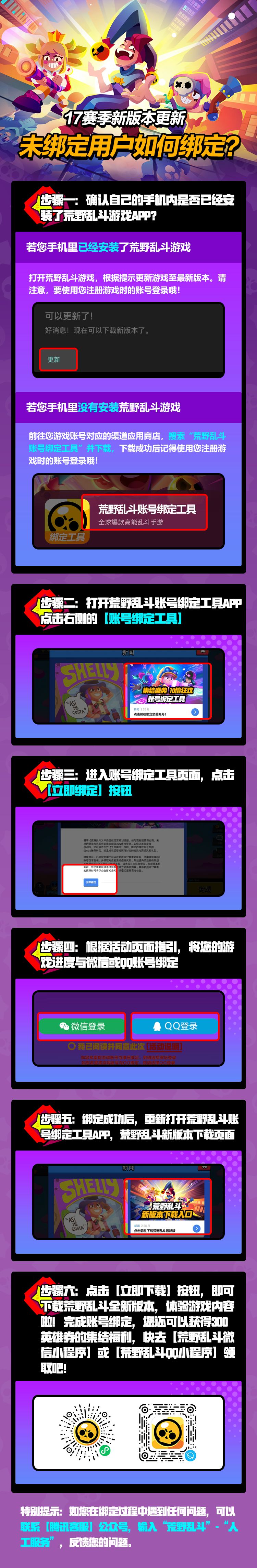 亲爱的斗士: 本次维护更新现已完成,《荒野乱斗》17赛季最新版本现已火热上线,您可以前往各大应用商店重新下载游戏客户端-【荒野乱斗游戏APP】进行体验。 或通过您手机上已经更新的【荒野乱斗账号绑定工具APP】中,新闻公告第二条-下载入口,下载最新的游戏APP进行体验。 若您还未绑定微信/QQ账号,可前往原账号对应的各大应用商店或游戏社区,搜索【荒野乱斗账号绑定工具APP】。打开账号绑定工具APP,