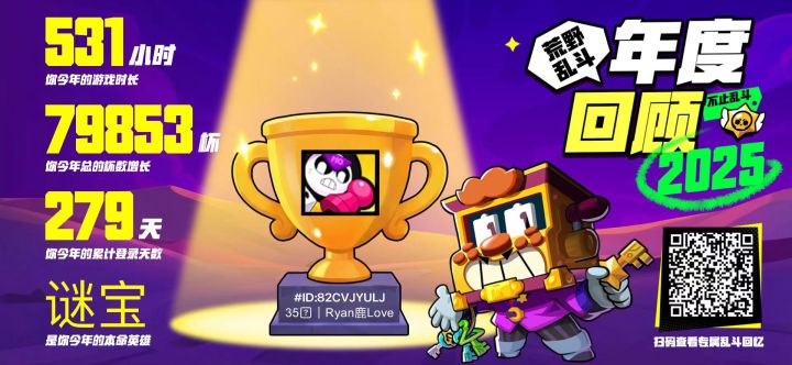 2025年,我在《荒野乱斗》的世界里,留下了一串滚烫的数字:531小时的酣战、79853杯的成长、279天的坚守,还有本命英雄谜宝的一路相伴。这531个小时,是无数个放学后的傍晚、周末的午后,我和队友们在宝石争霸、荒野决斗里并肩作战的时光。从手忙脚乱的新手,到能精准预判对手走位的老玩家,每一次技能释放、每一次团队配合,都藏着我的成长。79853杯的杯数增长,不是冰冷的数字,而是我在每一场对局里咬