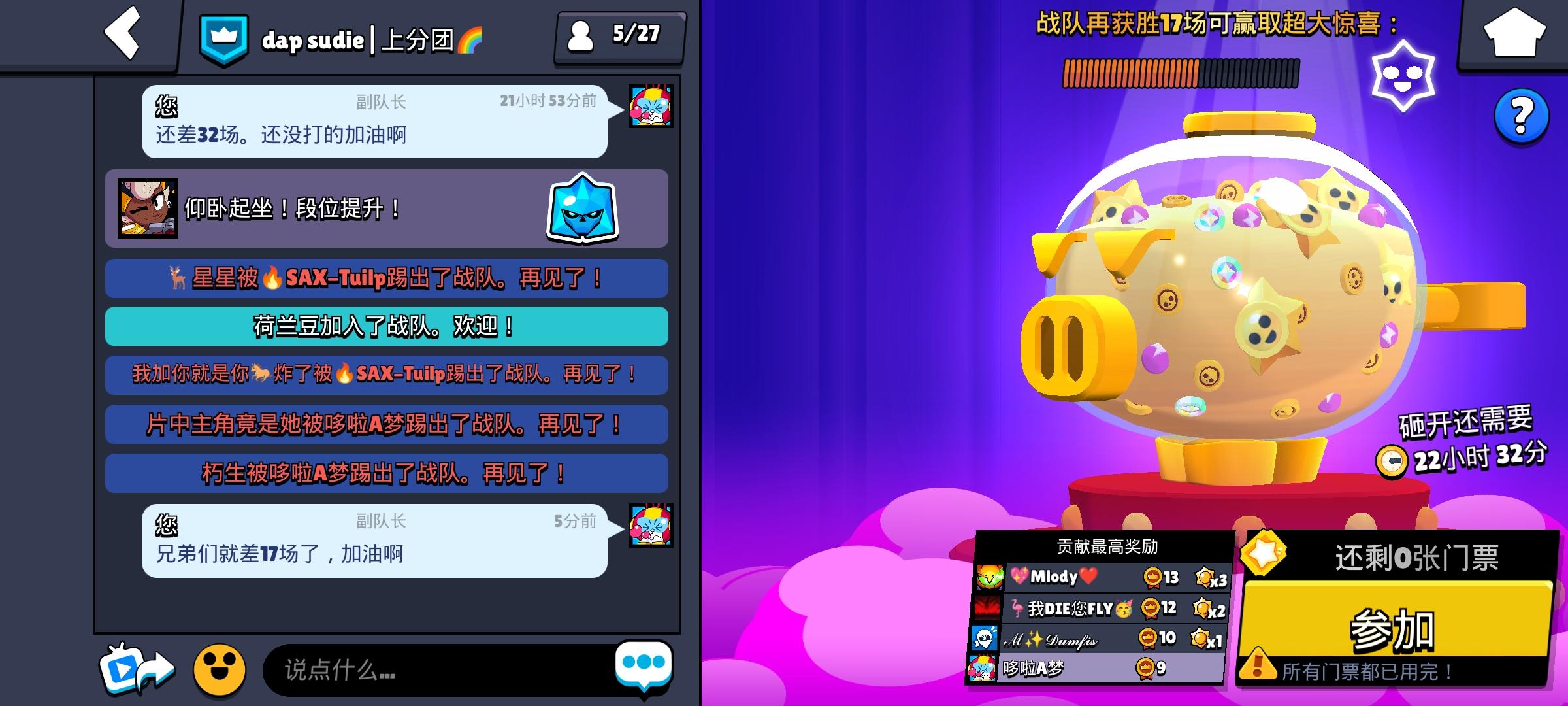 战队还差17票就打满了,还有票的兄弟来!战队id:#2Y0PLCUQ