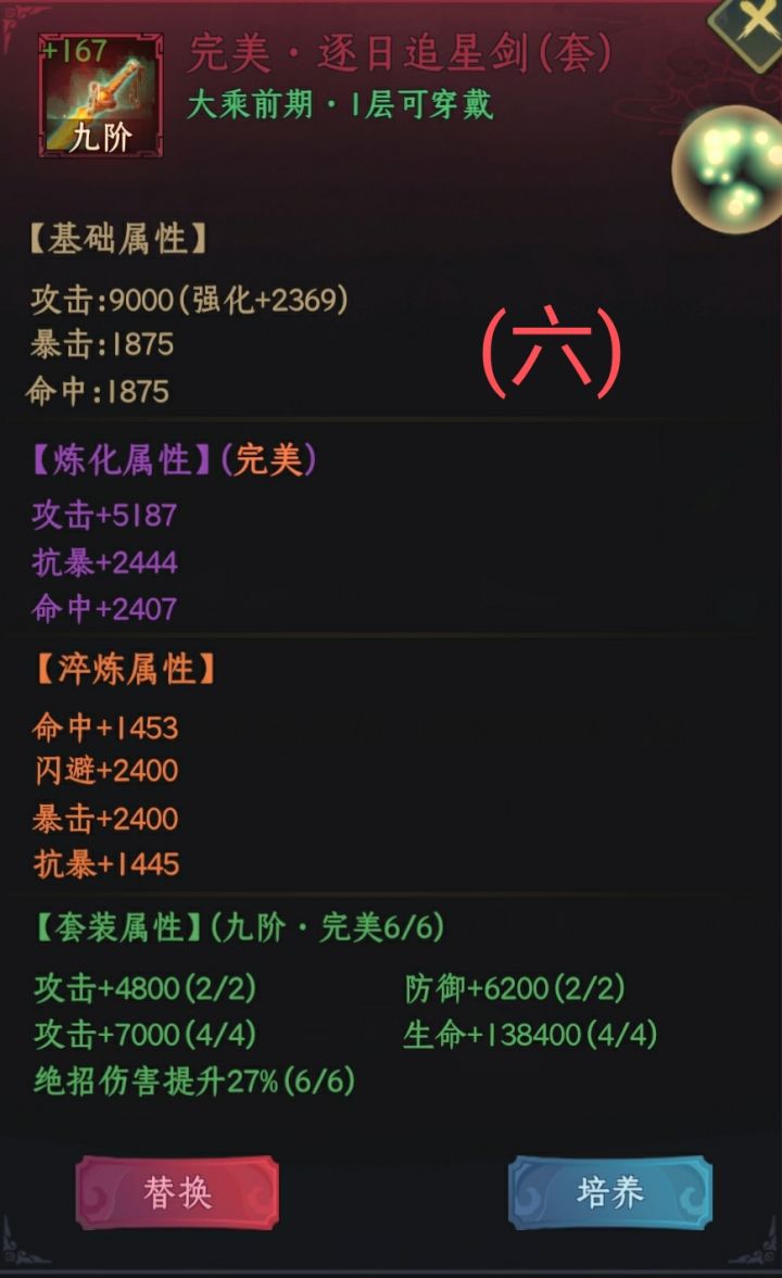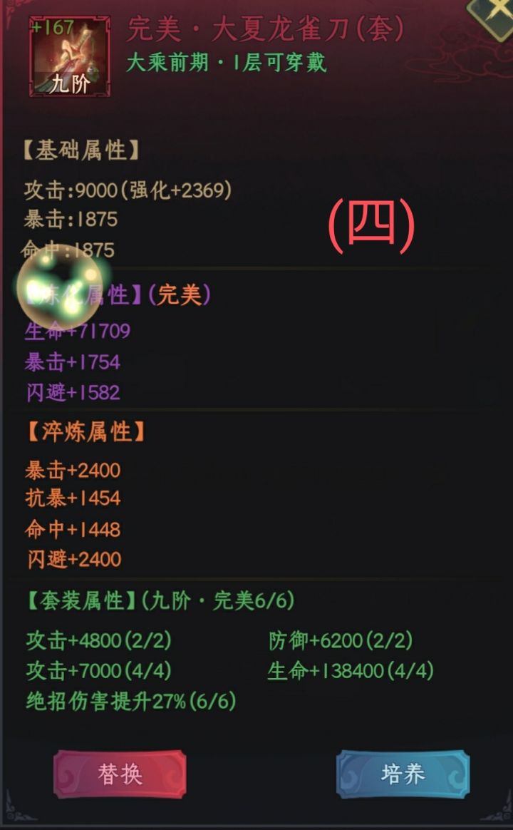 看了看论坛多是前期攻略,那我发一发中期攻略吧,无聊只能研究一下PVE了,PVP没有研究法。也欢迎大家一起探讨哇!思路:多抗两下,多打两发法刀。心法:化虚飞升决(概率复活)法宝:亢龙锏(减费)技能:玄牝剑法、法刀驱龙、太初剑阵、魔神护身伙伴:句芒、冰帝、千童、精卫(避雷无面)刚需:精4亢龙锏,三星句芒,四星火凤凰,五星青龙,符文4红2橙过程:亢龙锏减费,增加技能释放频率,所以4号位选择