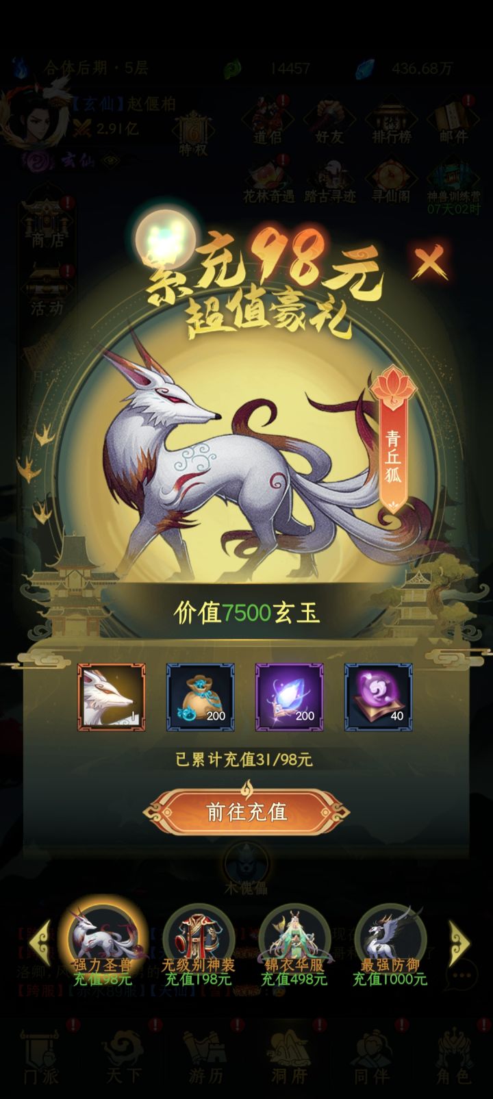 修仙37栽,氪金31,伙伴就是你们看到的。今天晚上可以升一个四星伙伴,红宝三个,亢龙锏重复了,所以地灵可以精四,神兽我只养到朱厌梼杌火凤凰三星,现在在换随机碎片包,自选包价格是三倍,打算长期玩可以考虑随机包。如果需要话我可以上个攻略#一起来修仙