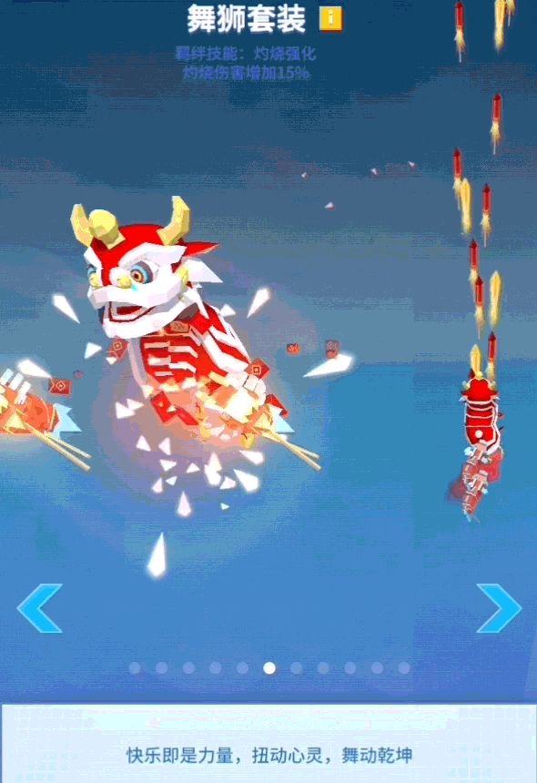 快乐即是力量,扭动心灵,舞动乾坤!今天给飞行员们介绍两款舞狮套装,快接受这满满的活力吧! 舞狮套装 第一款舞狮套装是由战机牛师傅、武器穿云炮、宠物神火龙和圣火绫光翼组成的。装备两件提升血量,装备三件提升攻击,而激活整个套装可以增加灼烧伤害。 先来看看舞狮套装的外形,活泼可爱的“牛师傅”身着大红装,舞着一只大眼睛红色狮子,旁边还坠着钱币和红包,真是满满的中国风!而两只好动的神火龙和连珠的穿云炮也是神